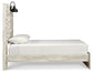 Includes headboard, footboard and rails, Made of engineered wood (MDF/particleboard) and decorative laminate, Wispy white finish over replicated oak grain with authentic touch, 2 decorative sconce lights, LED with 3 AA batteries, 2 slim-profile USB charging ports, Power cord included; UL-listed, Foundation/box spring required, sold separately, Mattress available, sold separately, Assembly required, Bed is compatible with an adjustable base