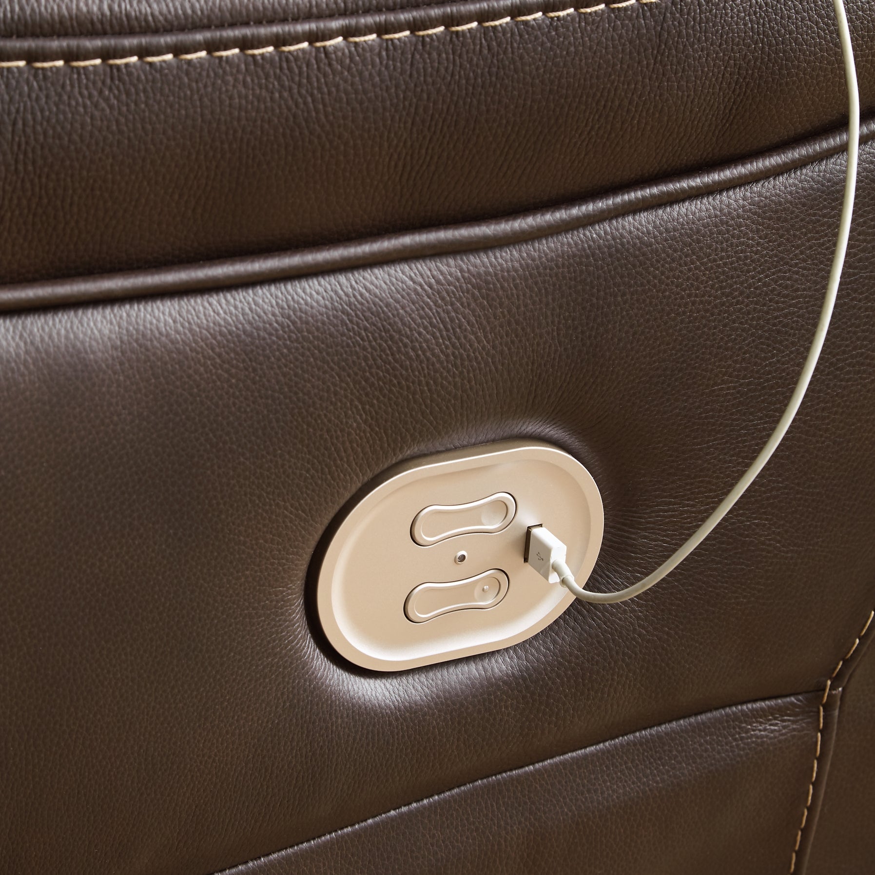 Load up on comfort in a cool, clean-lined and contemporary way with this power reclining loveseat with console in chocolate brown. Rest assured, the expertly matched leather and faux leather upholstery is enriched with a pebble grain effect for authentic appeal and enhanced with jumbo stitching for dramatic contrast. It features a one-touch power control with adjustable positions, along with an Easy View™ adjustable headrest that allows a primo view of the TV even when you're reclined. Extended ottomans provide extra length for leg comfort. A zero-draw USB plug-in at your fingertips lets you charge up as you chill out.