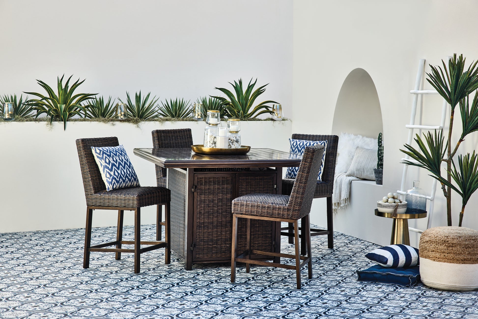 Turn your backyard space into your own piece of paradise with this outdoor dining set. Though the fire pit table looks remarkably like wood, it’s made of sturdy, rust-proof aluminum that’s perfectly suited for alfresco living. Enhancing the rustically refined aesthetic: side panels accented with all-weather, handwoven resin wicker. With the press of a button, ignite a flickering flame that dances over a bed of glass beads. The matching bar stools are pretty enough for trendy interiors, yet durable enough to weather the elements.